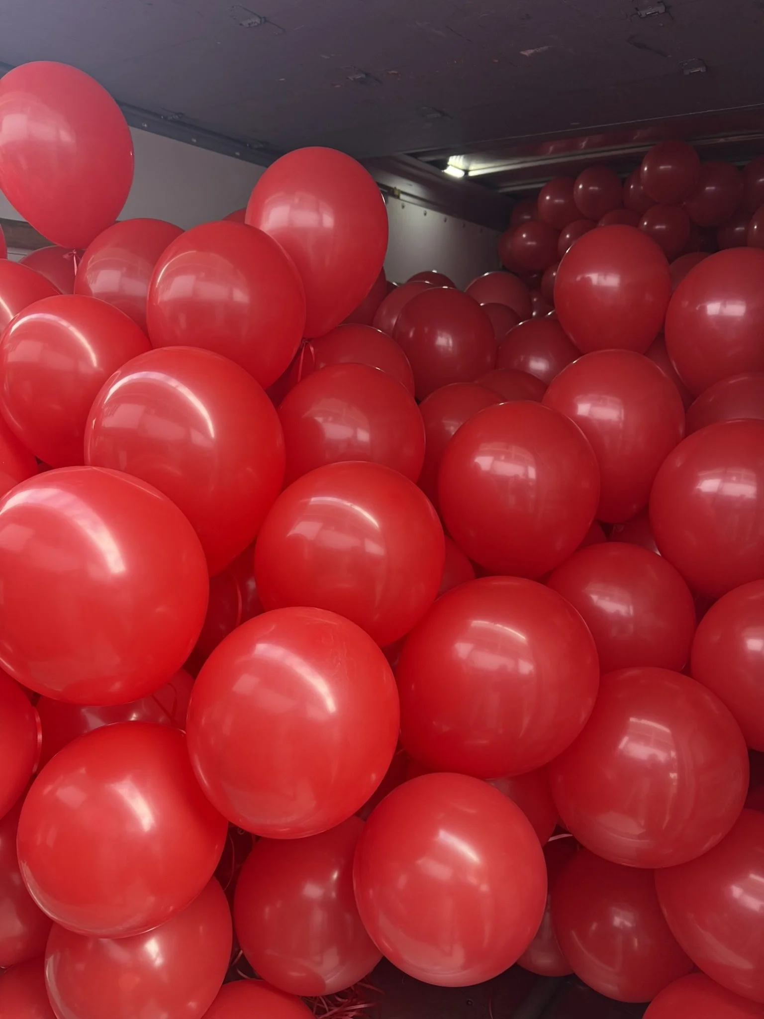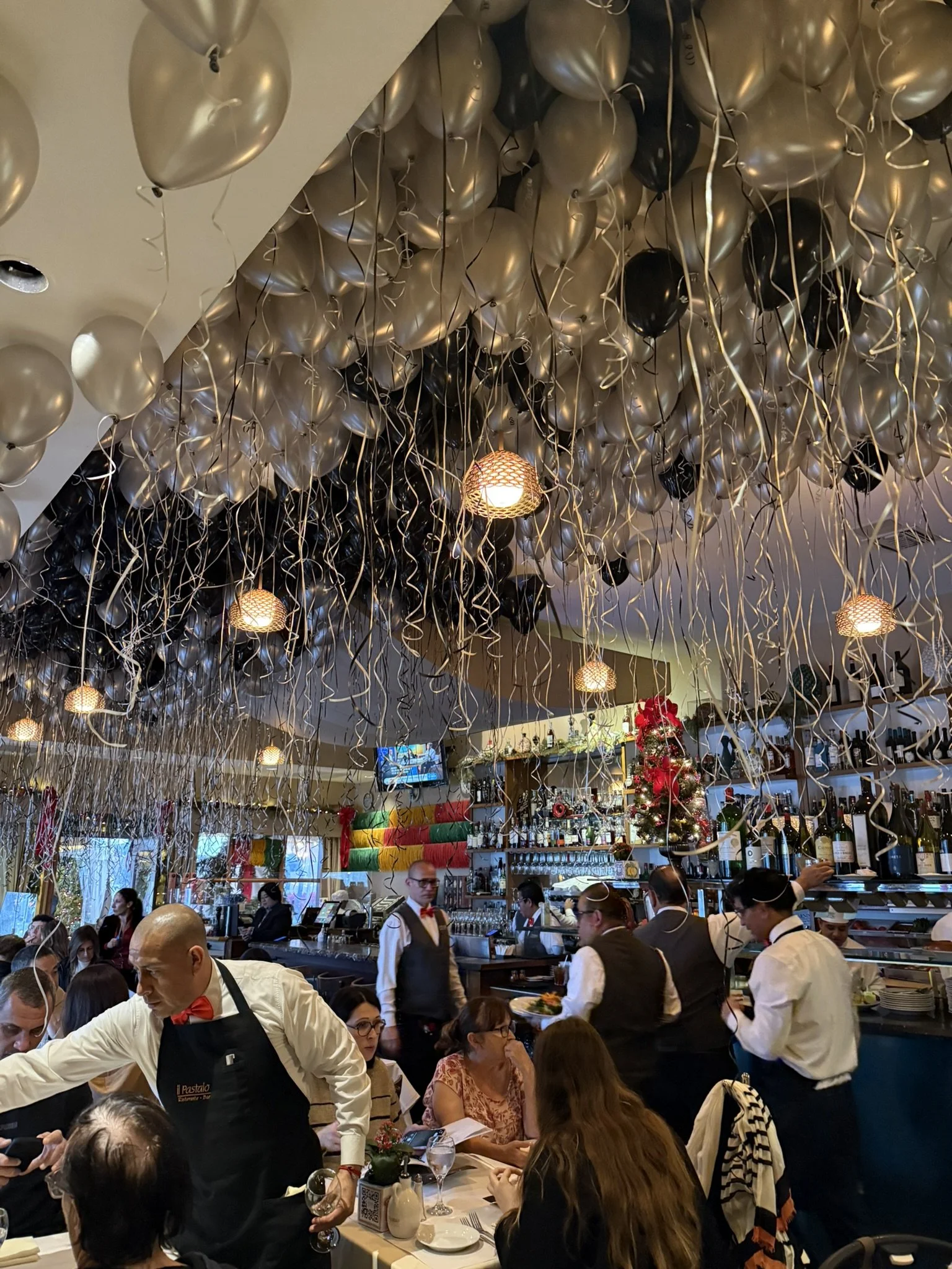 Imagine 750 glossy red balloons being carefully guided through a standard restaurant doorway while the dining room is completely packed.