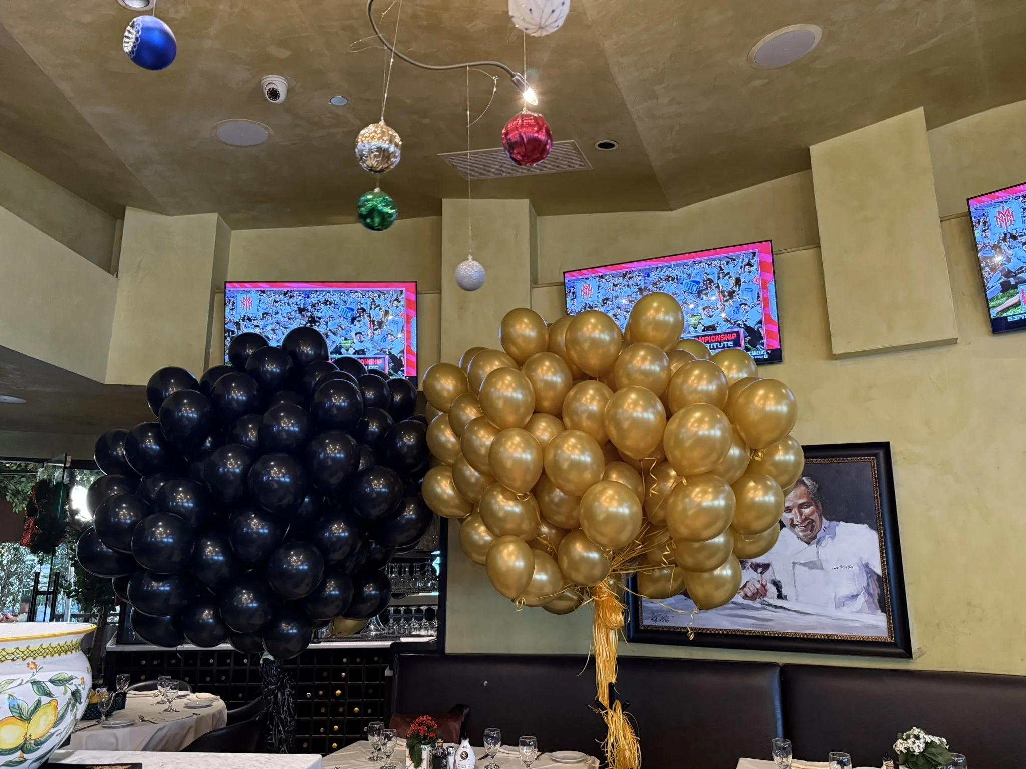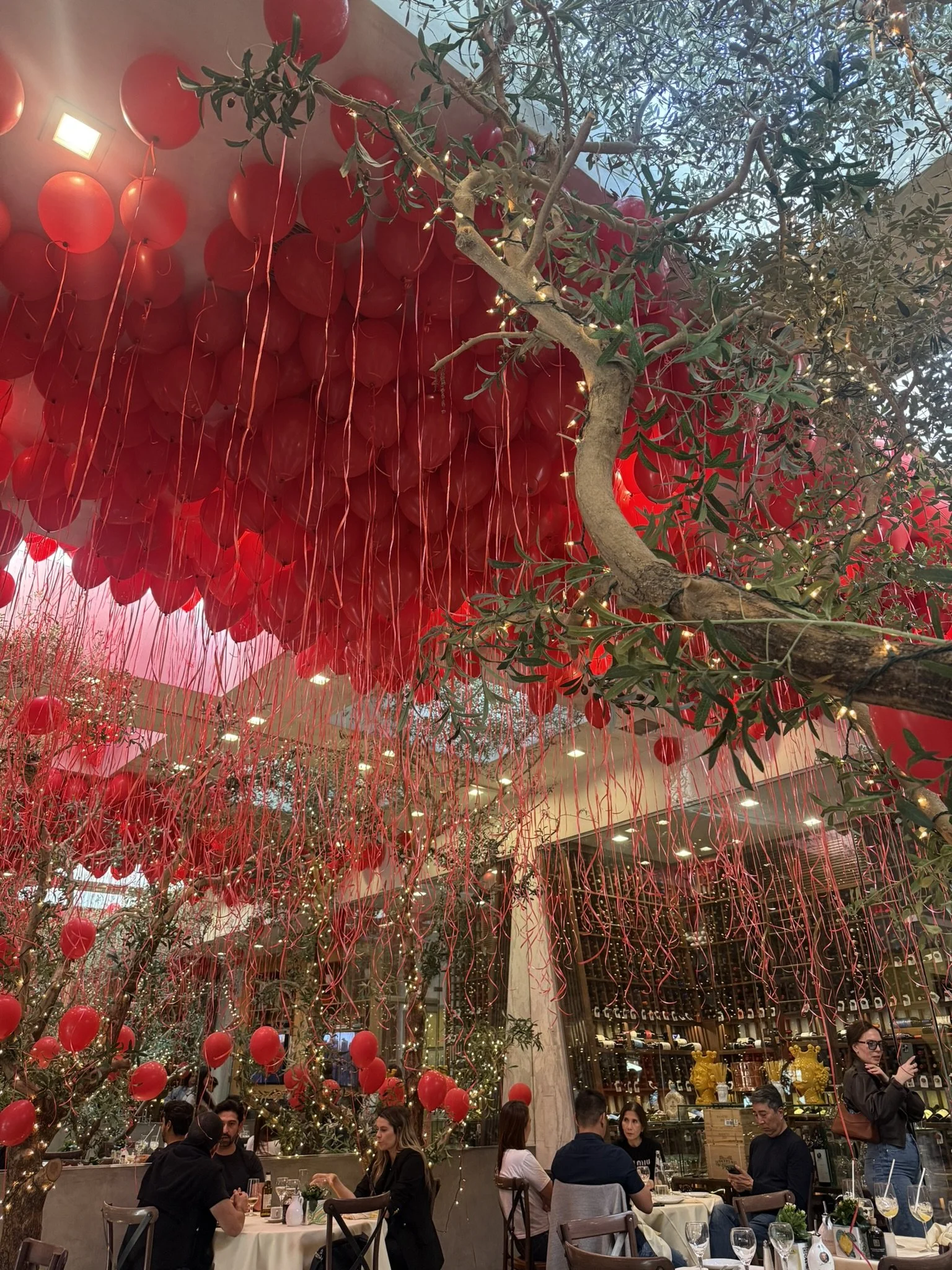 Nearly 2,500 bright red balloons filled multiple Beverly Hills restaurants during one of the busiest dining nights of the year.